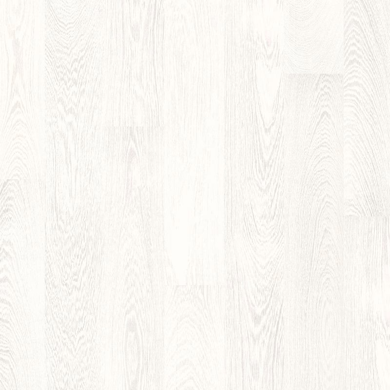 Deze laminaatvloer heeft een zachte wit-eiken tint met een subtiele houttekening, waardoor hij een natuurlijke en frisse uitstraling heeft.